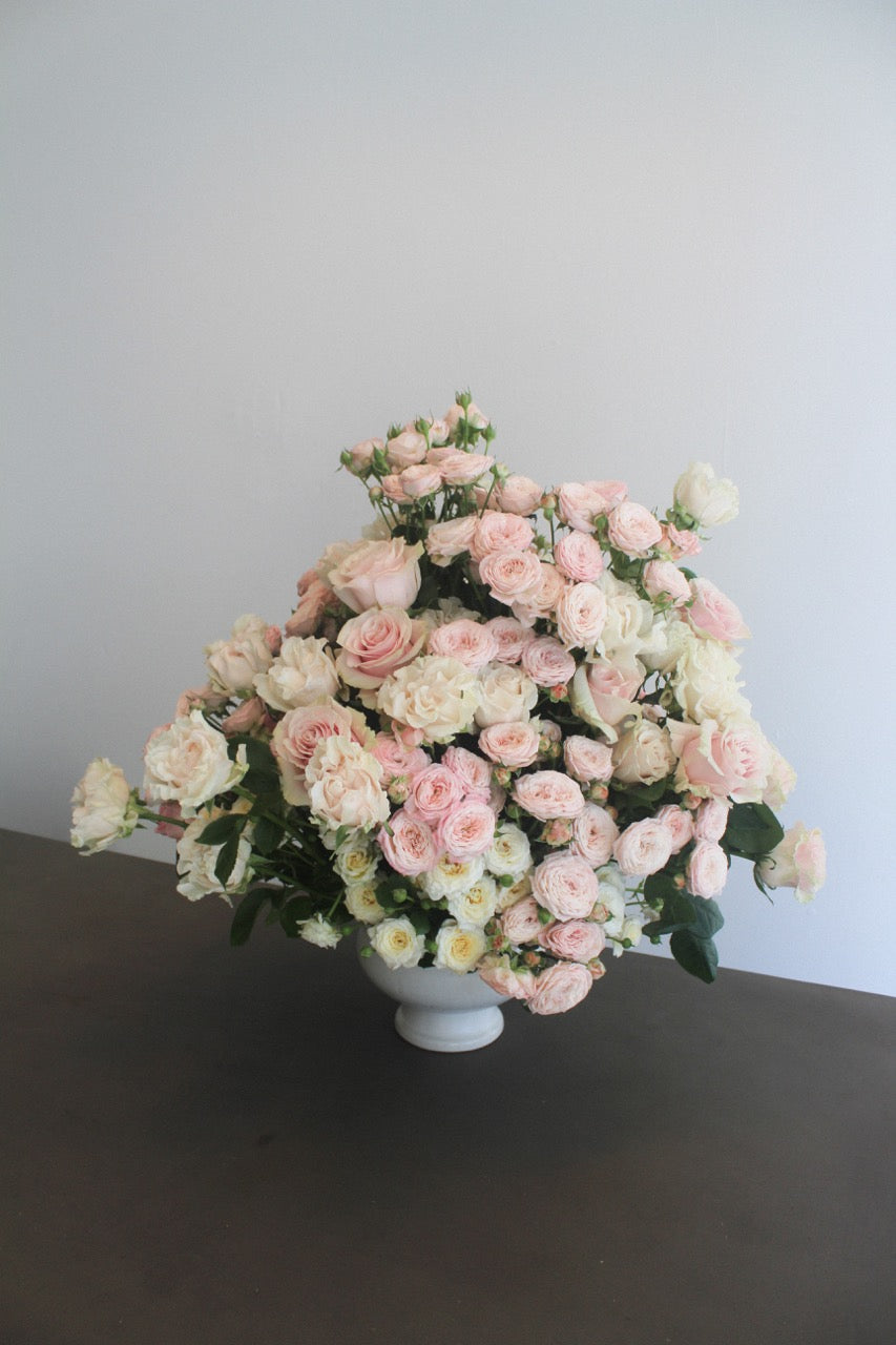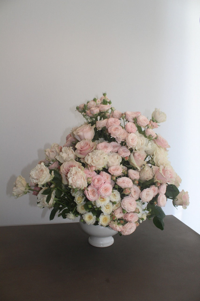 A mix of 80 stems of the most fragrant white roses, pink garden roses, and garden spray roses, artfully arranged in a white ceramic compote.