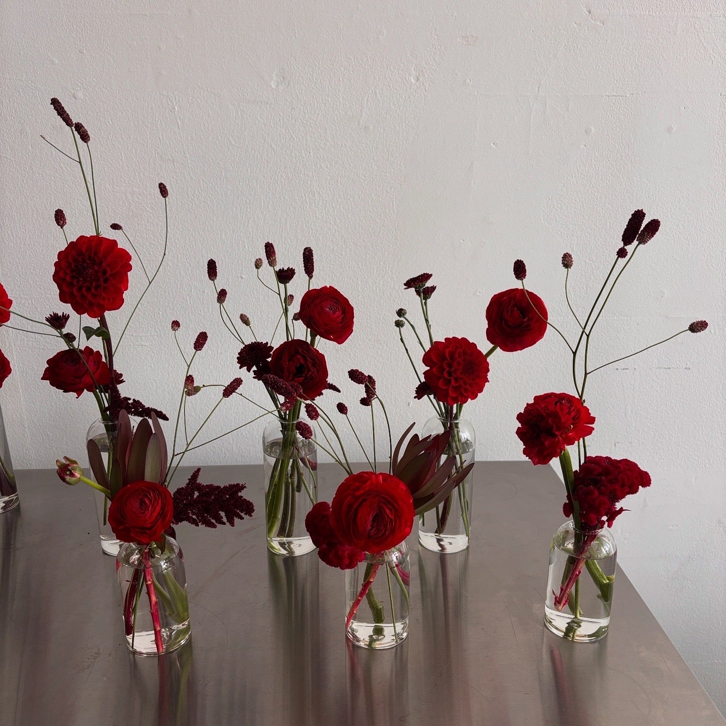 Minimalist design in monochromatic color palette. Seasonal flowers in glass bud vases.