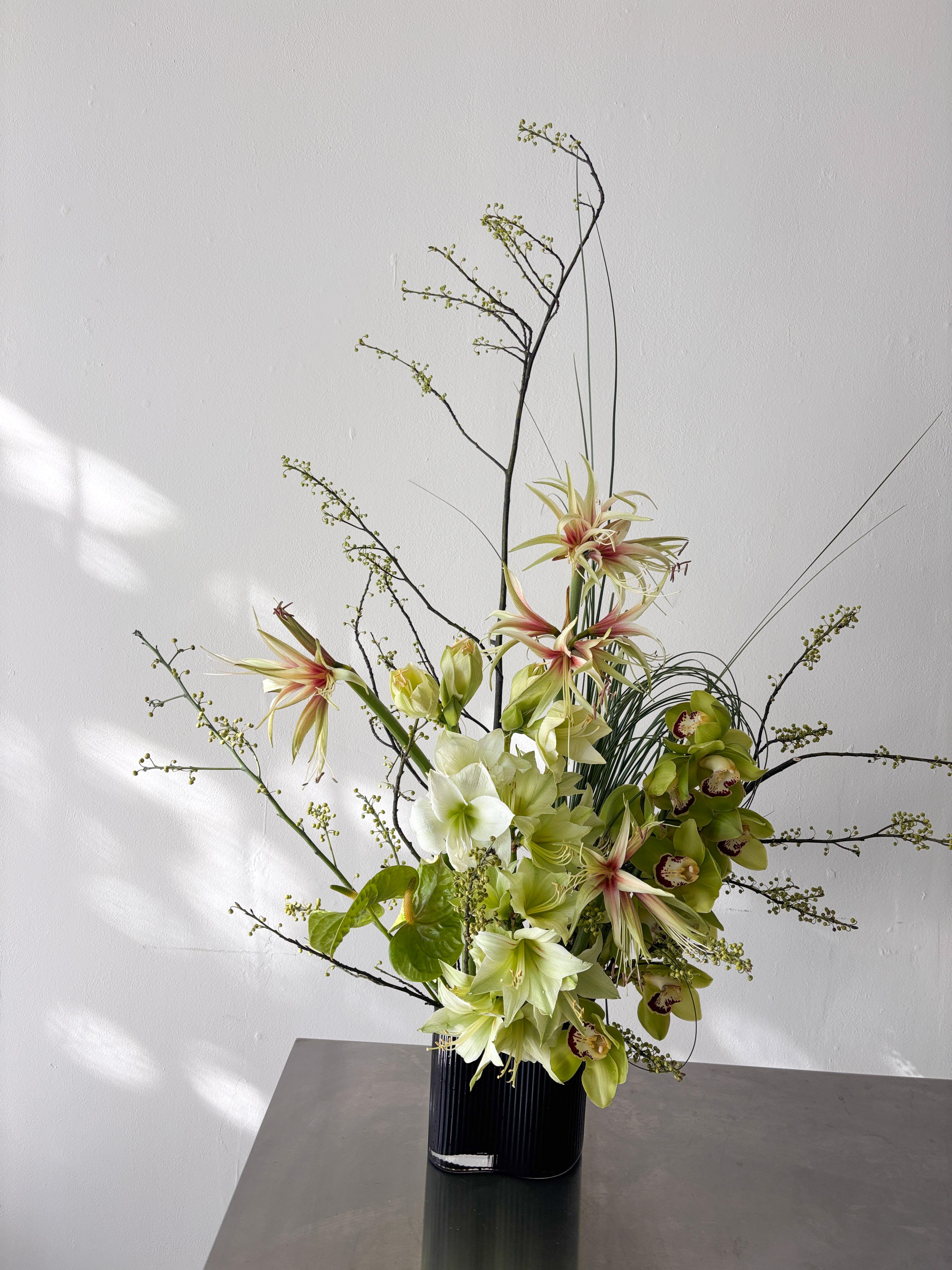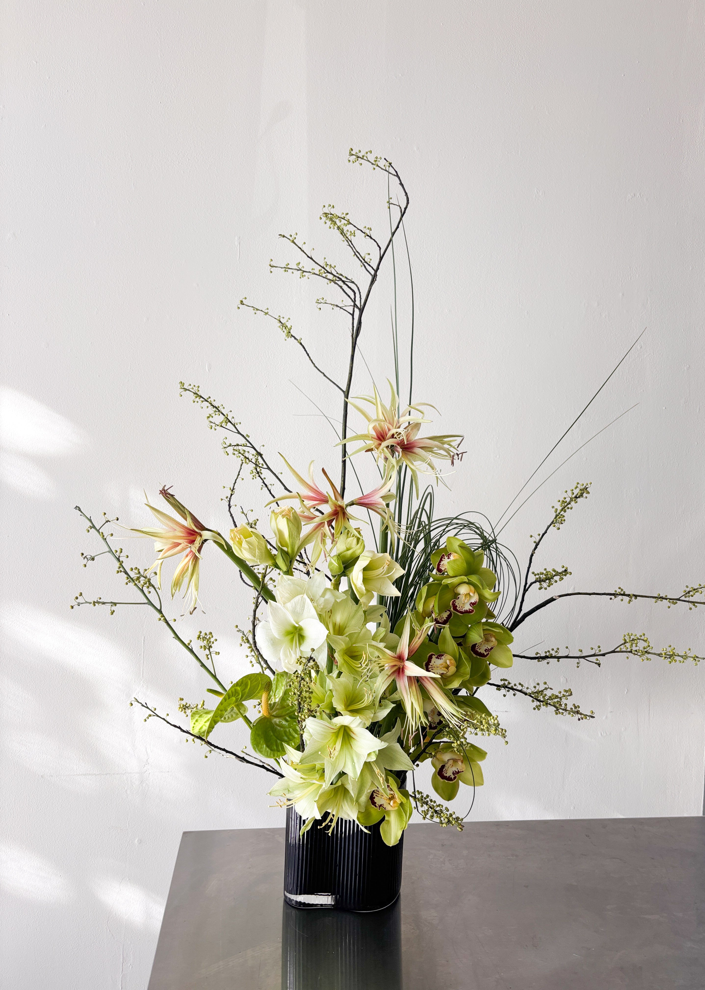 Monochromatic green floral arrangement designed to make a statement. Flowers included: amaryllis, Japanese branches and Lady’s slippers green orchids.