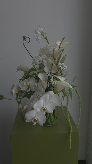 Mono white bridal bouquet made with the finest garden roses, white orchids, white cala lilies, white anthurium, amaranth and other seasonal white blooms.