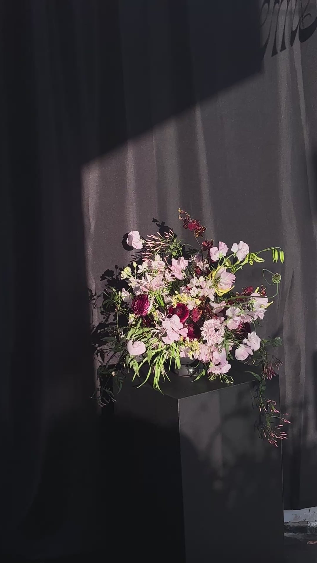 Flowers include: sweet peas, Japanese ranunculus, checkered Frittilaries, Japanese onion, Japanese Gloriosa Lilies, black and yellow exclusive orchids, burgundy ranunculus, nerine, and jasmine.