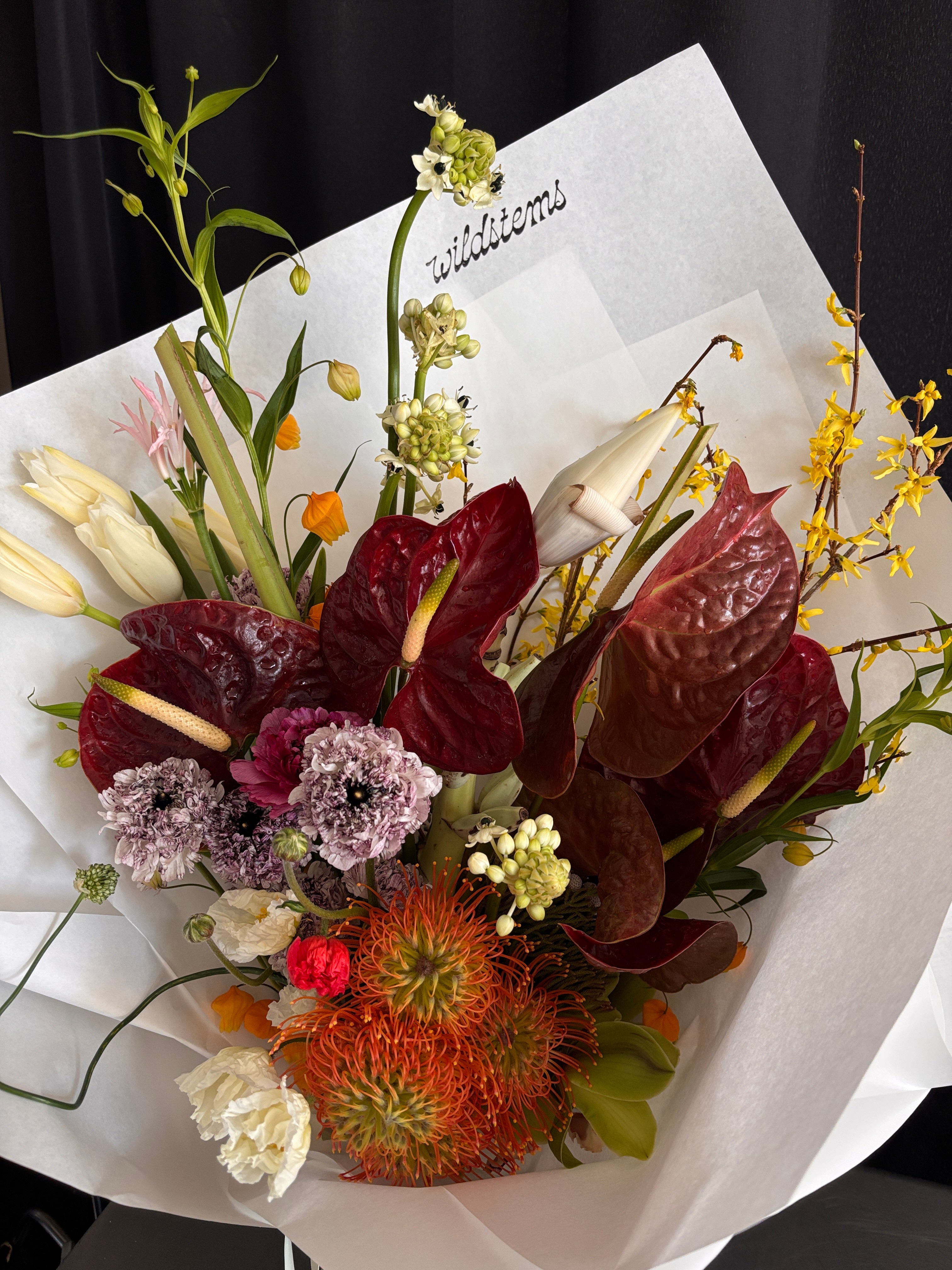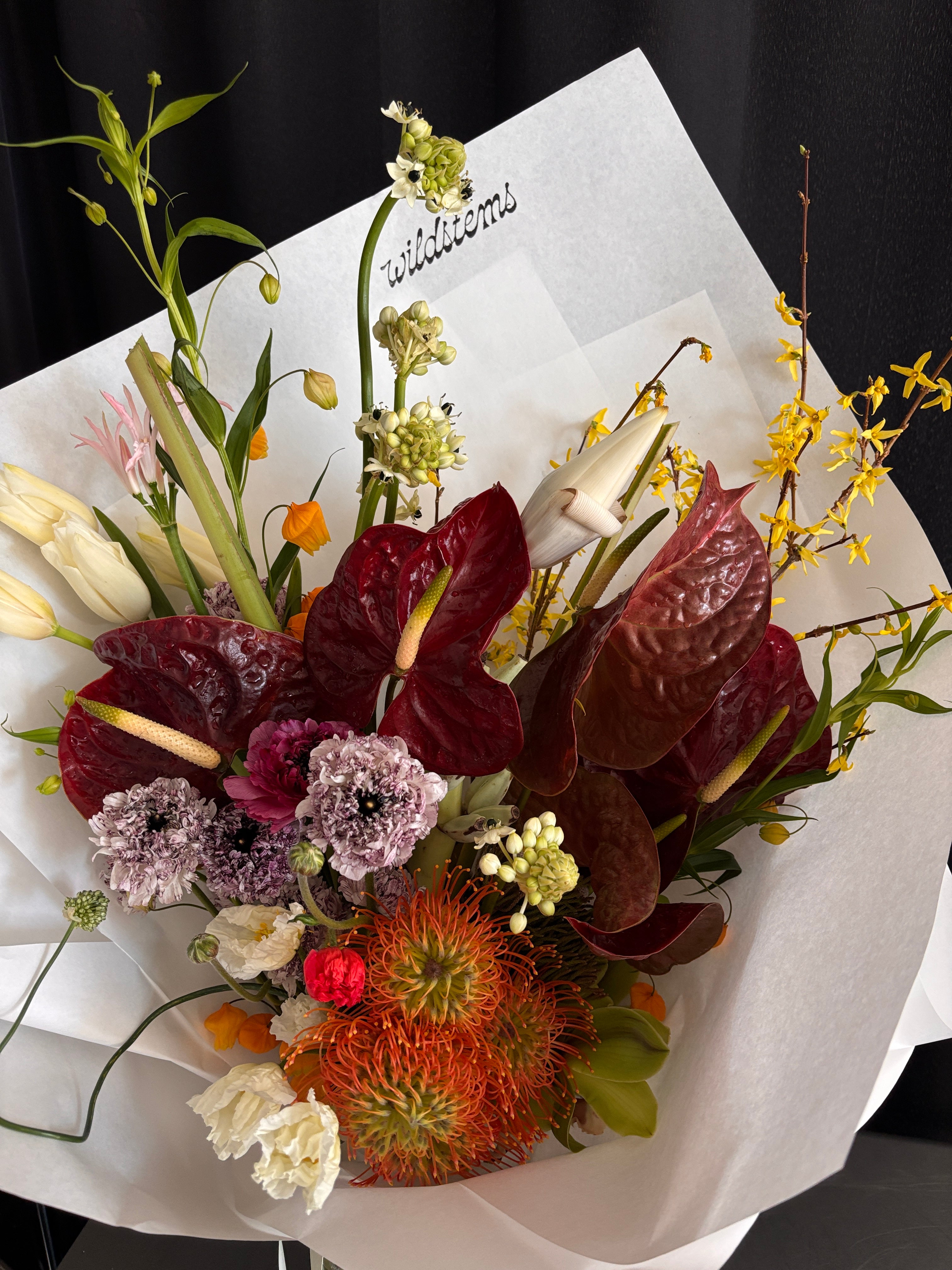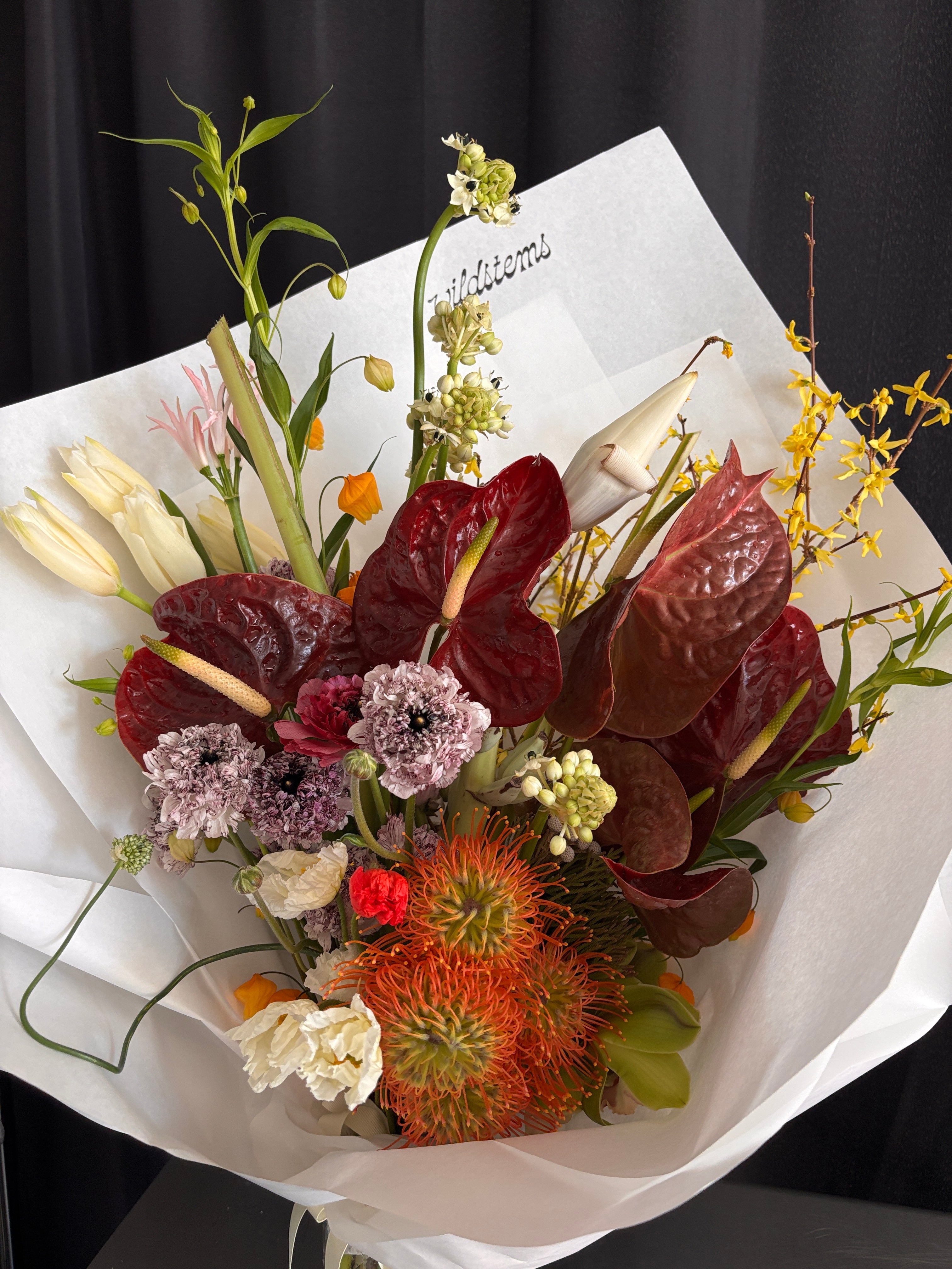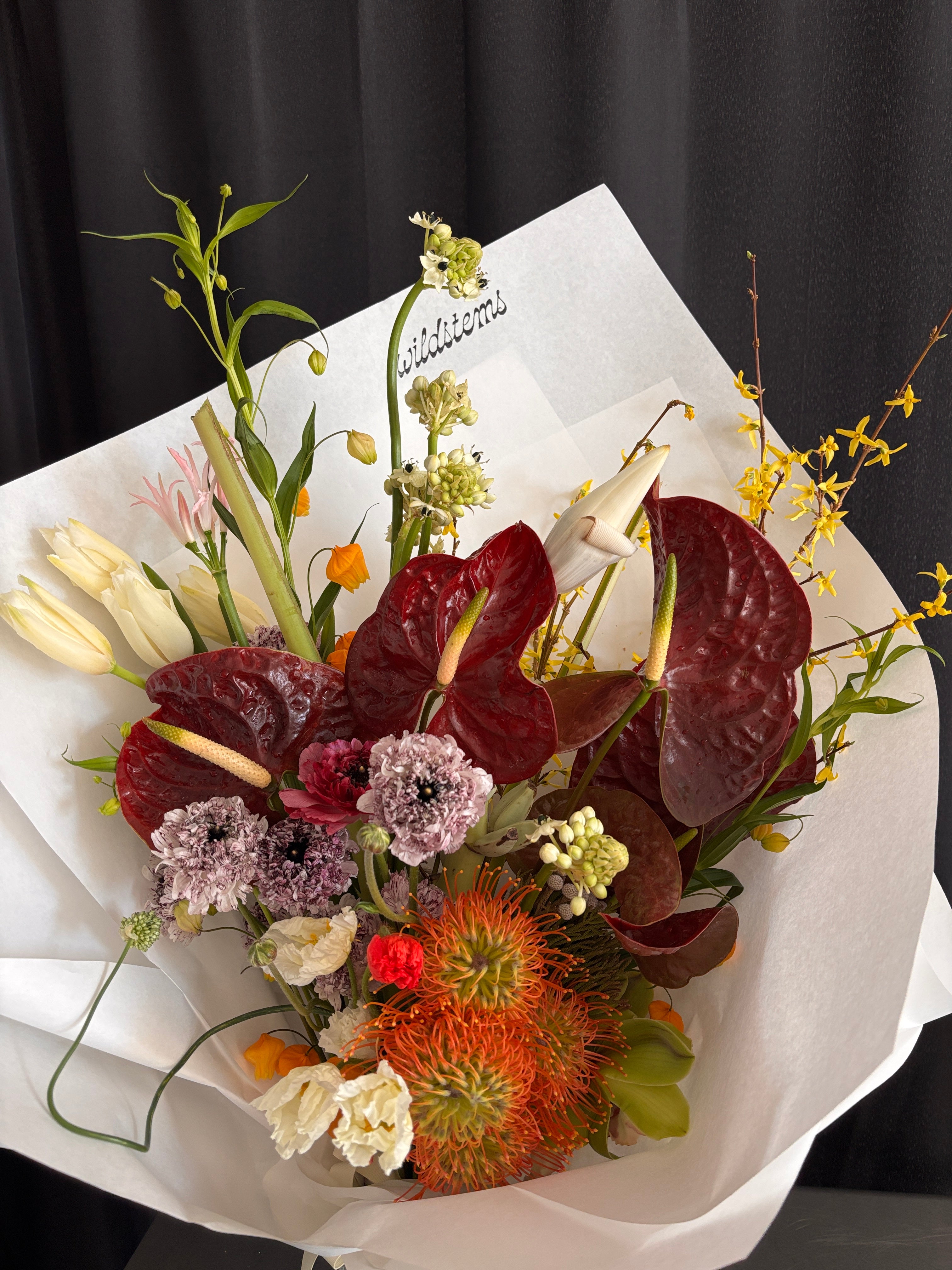 A floral arrangement designed with exotic, tropical and alien looking flowers. A mix of textures, colors and shapes.