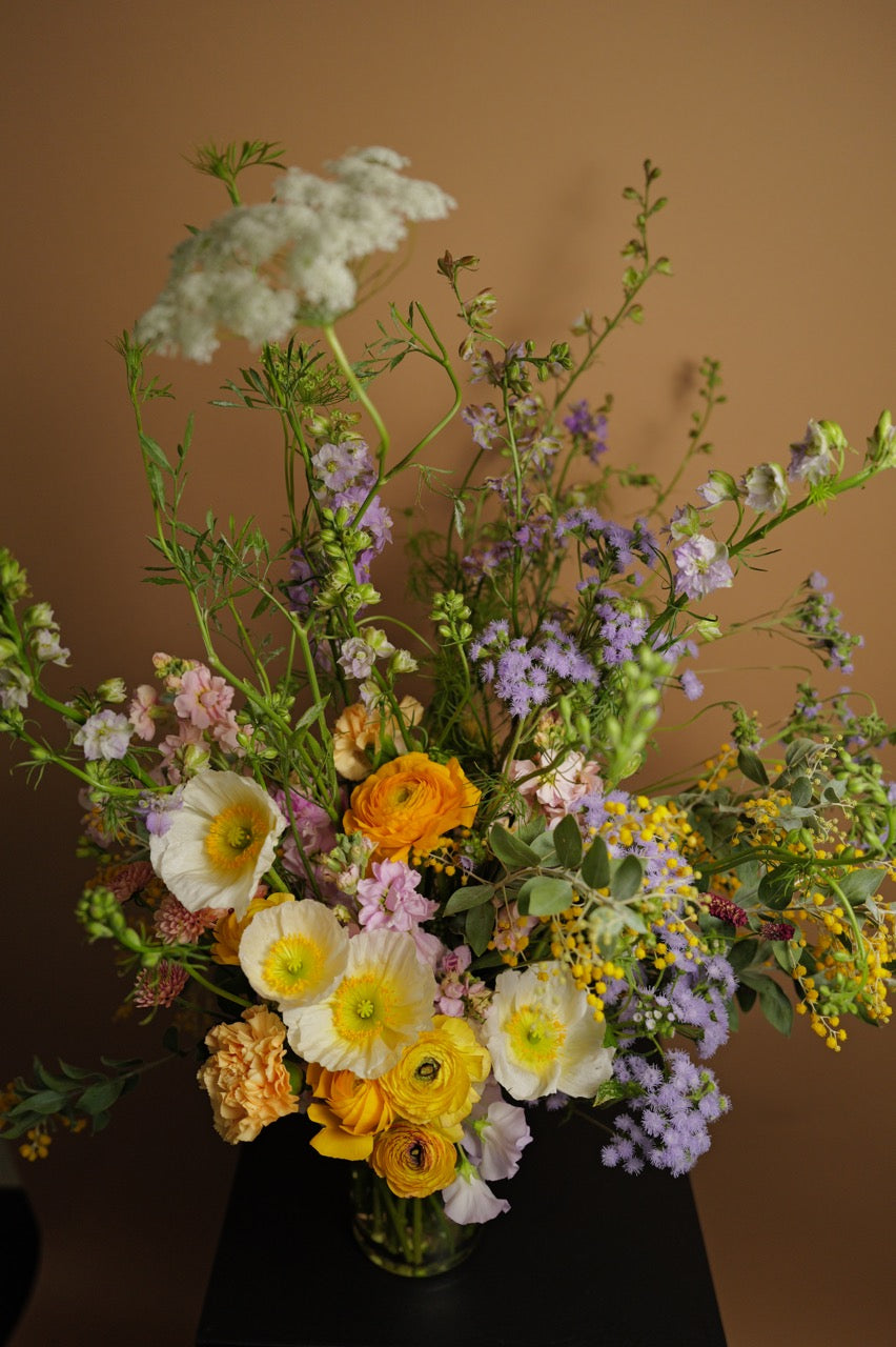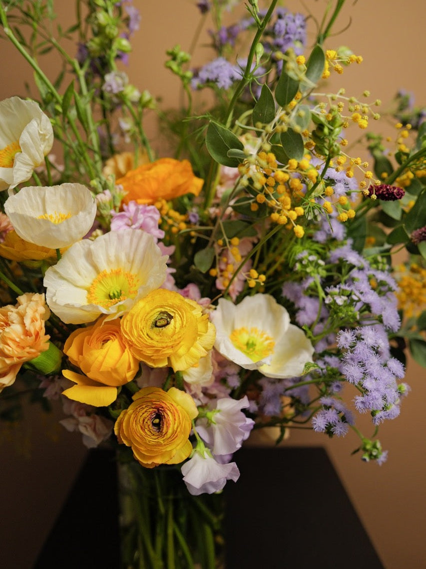 Flowers included: yellow ranunculus, locally grown poppies, peachy stock, larkspur, mimosas and other seasonal wildflowers.